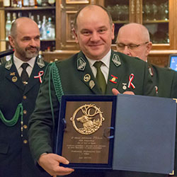 W dalszej kolejności przystąpiono do wyróżniania najbardziej aktywnych myśliwych odznaką honorową i dyplomem Króla Sezonu (Grzegorz Przydatek), I V-ce Króla Sezonu (Jan Bursy) i II V-ce Króla Sezonu (Tomasz Blacharski), oraz odznaką honorową i dyplomem Lisiarza sezonu (Piotr Gajewski na obw. 44 i Tomasz Blacharski na obw. 115), I V-ce Lisiarza sezonu (Waldemar Siekierka na obw. 44 i Henryk Kwik na obw. 115) i II V-ce Lisiarza sezonu (Waldemar Wilk na obw. 44 i Stanisław Iżycki na obw. 115). Dokonano też wręczenia zaległych odznak, I V-ce Lisiarza sezonu 2013/2014 na obw. 44 (Erwin Kowalik), II V-ce Lisiarza sezonu 2013/2014 na obw. 115 (Henryk Kwik), I V-ce Lisiarza sezonu 2014/2015 na obw. 115 (Ryszard Janos), I V-ce Lisiarza sezonu 2015/2016 na obw. 44 (Erwin Kowalik) i I V-ce Lisiarza sezonu 2016/2017 na obw. 44 (Waldemar Siekierka). Wręczenia wszystkich odznak honorowych i dyplomów dokonali Łowczy Kolega Andrzej Romanowicz i Podłowczy Kol. Stanisława Iżycki Rozstrzygnięto również konkurs fotograficzny, nad którego IV edycją wisiało prawdziwe fatum, niemożność nie tyle rozstrzygnięcia co ogłoszenia wyników, bądź to z powodu nieobecności inicjatora i pomysłodawcy Kolegi Mariusza Krzywickiego, bądź z powodu nieobecności laureatów głównych nagród. Kolega Grzegorz Przydatek przypomniał sylwetki jury konkursowego a ogłoszenia wyników dokonał Mariusz Krzywicki. Nagrodę główną w kategorii wiekowej do lat 15 zdobył Maciej Kontek, a w kategorii wiekowej dorośli Kol. Cezary Bąk. Wyróżnieniami w poszczególnych kategoriach podzielili się Joanna Kontek, Stanisław Iżycki i Cezary Bąk. O pomoc we wręczaniu nagród, wyróżnień i dyplomów poproszeni zostali Kol. Zdzisław Dzwonnik i Wojciech Plewka. Oficjalną część uroczystości zakończyło odprowadzenie sztandar Koła przy dziękach Marszu nr 3. Zanim dźwięki sygnałówek zaprosiły na posiłek, Skarbnik Kol. Stefan Kulik poinformował, iż dla członków koła i gości przygotowane są upominki, komplet ręczników z logo koła i okolicznościowy znaczek, nawiązujący do pierwszego znaczka naszego koła wybitego w latach 60-tych ubiegłego stulecia. Wielką niespodziankę sprawił przybyły z opóźnieniem przedstawiciel Starosty Nyskiego, Naczelnik Wydziały Rolnictwa i Ochrony Środowiska w Starostwie Nyskim Pan Jacek Tarnowski, który w imieniu Starosty przekazał myśliwym pilarkę spalinową. Zapraszam do obejrzenia fotoreportarzu z części oficjalnej uroczystości i nie tylko.